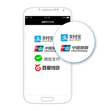 银联收银台,为iOS/Android原生/H5 App提供支付解决方案:支持微信支付、支付宝支付、银联手机支付、百度钱包等。